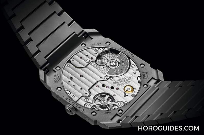 其所搭載的BV自制BVL305自動上鏈機械機芯,厚度僅2.75mm。這枚機芯具備功能包含:時、分、逆跳日期、星期、月份和逆跳閏年顯示,動力儲存60小時。整個機芯采用超過408枚零件,要如何在厚度僅5.8mm的表殼空間內和諧運轉,寶格麗Le Sentier表廠采用全新制表工藝手法,搭載微型自動盤,在不縮小零件尺寸的情況下,充分利用機芯零件之間的空間才能夠達到如此纖薄的成效。微型自動盤以鉑金打造,表面施以黑色噴砂處理,并鐫刻有「BVLGARI」與「Perpetual Calendar」字樣,相當特別。