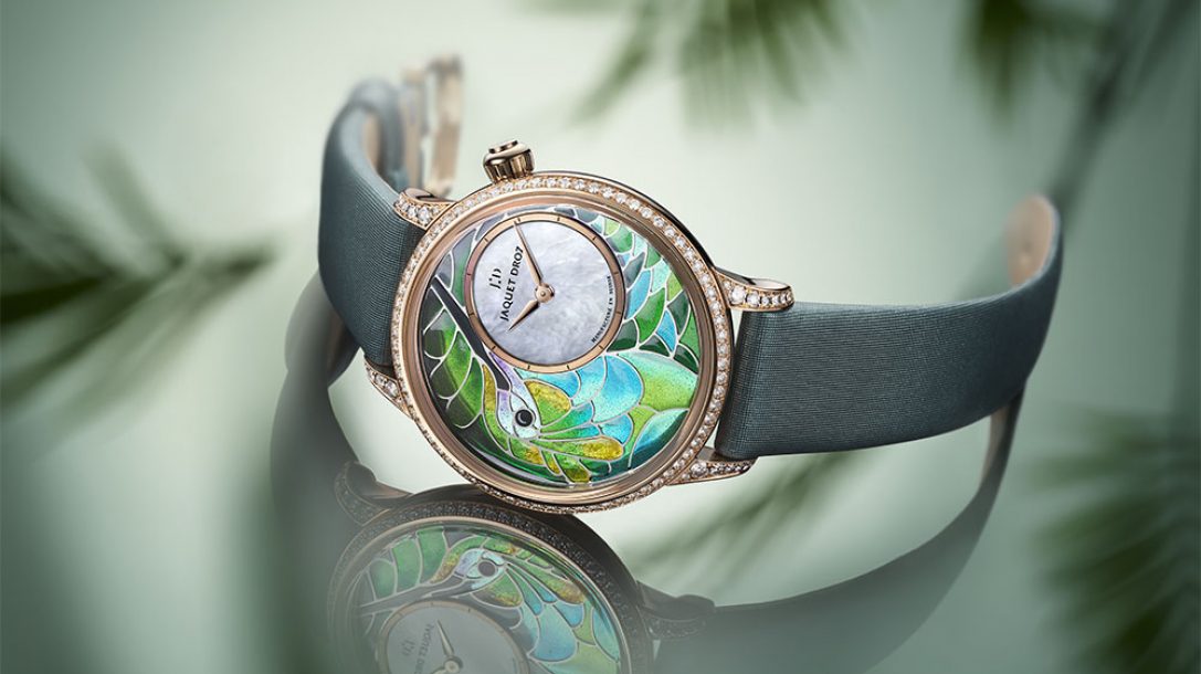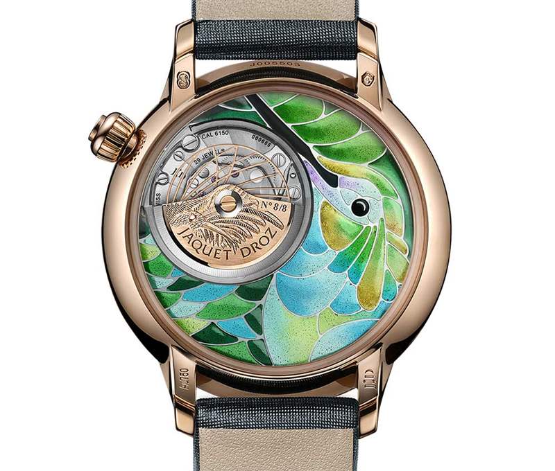 每秒高達(dá)200次機(jī)翼沖程…世界上最微小的鳥展開了其令人難以置信的能量,向前,向后移動(dòng),甚至在現(xiàn)場盤旋。雅克德羅(Jaquet Droz)通過一個(gè)獨(dú)家的,編號的系列,只有八件,小巧的Heure Minute Smalta Clara蜂鳥,凍結(jié)了它的運(yùn)動(dòng)。祖先的琺瑯技術(shù)的加入為色彩鮮艷的自然主義藝術(shù)作品注入了活力。在白金表盤上,不同形狀和大小的隔板上都充滿了琺瑯,在窯中多次燒制后,具有許多彩虹綠色的細(xì)微差別。獲得的絕對透明度邀請光線以微妙的色調(diào)塑造這種場景。而且,由于時(shí)間數(shù)據(jù)在2點(diǎn)鐘位置的白色珍珠母貝圓盤中偏離中心顯示,這件珍貴作品的裝飾占據(jù)了一席之地。為了給這件作品帶來更明亮的裝飾,表圈和表耳上散布著100顆鉆石,總重0.89克拉。