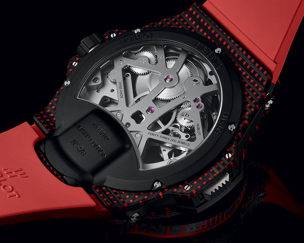 雄偉的HUB9009。H1.RA機(jī)芯在充滿未來感的表殼中栩栩如生。這款復(fù)雜的手動(dòng)上鏈機(jī)械機(jī)芯憑借其雙軸陀飛輪脫穎而出。調(diào)節(jié)裝置的雙重旋轉(zhuǎn)設(shè)置在鏤空表盤的6點(diǎn)鐘位置,每分鐘旋轉(zhuǎn)一次,每30秒旋轉(zhuǎn)一次,令人著迷和驚嘆。該電機(jī)使用約356個(gè)組件組裝而成,可為偏心的時(shí)針和分針以及日期顯示提供120小時(shí)的動(dòng)力儲(chǔ)存。9點(diǎn)鐘位置的指示器顯示剩余可用能量。