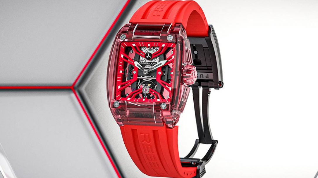 繼Magnum 540 Sapphire和令人難以置信的Weap-one鉆石不對稱陀飛輪之后,Rebellion首次推出了其RE-Volt表款,該表款專注于三種新穎的半透明表殼。所有產品均采用合成藍寶石制成,并強調透明度,以增強視覺情感。制表師們對細節的關注超越了極限,甚至以與表殼相同的材料制作了RE-Volt藍寶石的表冠。為這些獨家單品選擇的顏色毫不含糊地讓人聯想到那些在賽車世界中看到的顏色,這項運動對品牌來說永遠如此珍視。半透明的鏤空表殼和橋板直接在實心材料中著色,其雕塑般的輪廓就像超級跑車的車身一樣,有電藍色和激情紅色可供選擇。第三個版本,從頭到腳穿著白色,吸引了眼球。其色調的純潔性是鐘表最先進個性和分層場景設計的中心。