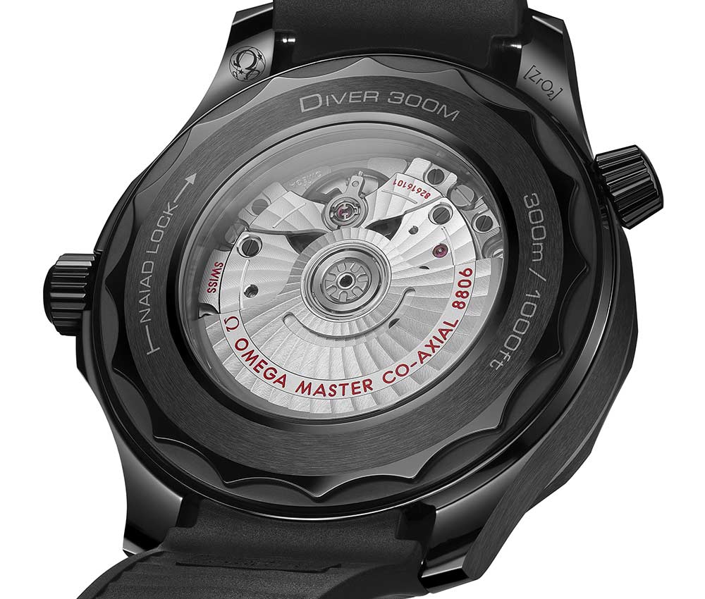 直徑43.5毫米的拋光緞面表殼以黑色陶瓷制成,氦氣排放閥和旋入式表冠也是如此。這款表殼與潛水裝備一樣量身定制,為同軸Master Chronometer 8806機芯提供保護。這款自動上鏈機芯憑借其計時和高達15,000高斯的磁場抗性,獲得瑞士聯邦計量研究所METAS認證,可提供約55小時的動力儲存。其擺陀以蔓藤花紋日內瓦波紋為特色,透過藍寶石水晶玻璃表背,令人贊嘆不已。
