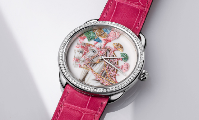 Arceau腕表可說是HERMèS發(fā)揮夢幻創(chuàng)意的空間,浪漫星月、靈動生物、經(jīng)典駿馬等各種豐富創(chuàng)意元素,都由品牌工匠以微繪、金線刺繡、細(xì)工鑲嵌或雕刻等各種工藝注入這款由傳奇設(shè)計(jì)大師Henri d’Origny設(shè)計(jì)并于1978年推出的標(biāo)志性腕表。早前,品牌再度揮灑工藝,推出限量24只的全新Arceau Harnais Fran?ais Remix工藝腕表,白金表殼鑲嵌82顆鉆石,并在瓷表盤上演繹手工雕刻與彩繪工藝,并搭配覆盆子色鱷魚皮表帶。