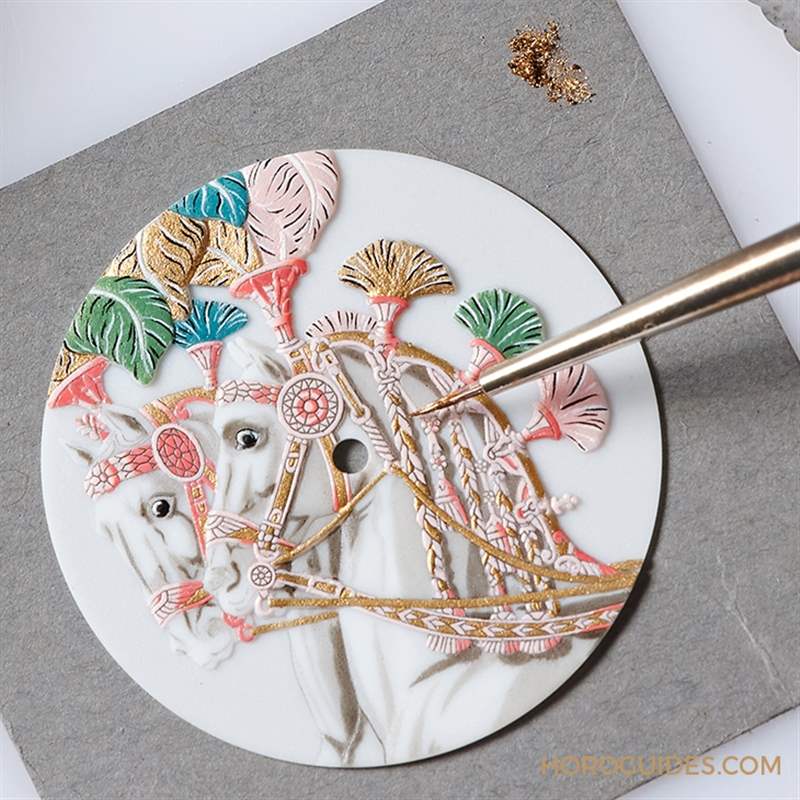 為了將此核心元素重現(xiàn)在表盤上,品牌工匠先于未上釉燒制的利摩日(Limoges)瓷胚上手工精雕駿馬輪廓,再精心地將色彩涂覆于其上,并在窯中精準(zhǔn)控制火候連續(xù)烘烤,以固定顏料并增強(qiáng)顏色飽和度,耗時近一個月制作而成。