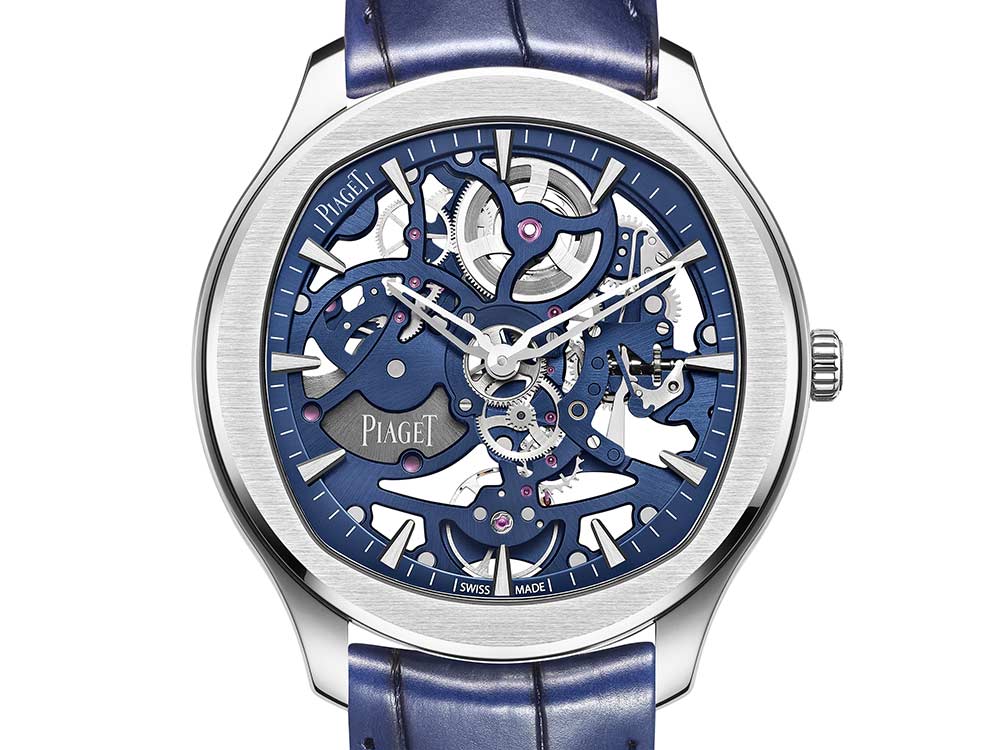 伯爵 Polo 藍色鏤空腕表 采用集成式精鋼鏈鏈環環繞手腕,該表鏈經過重新設計,可輕松與折疊式表扣隨附的皮革表鏈互換。